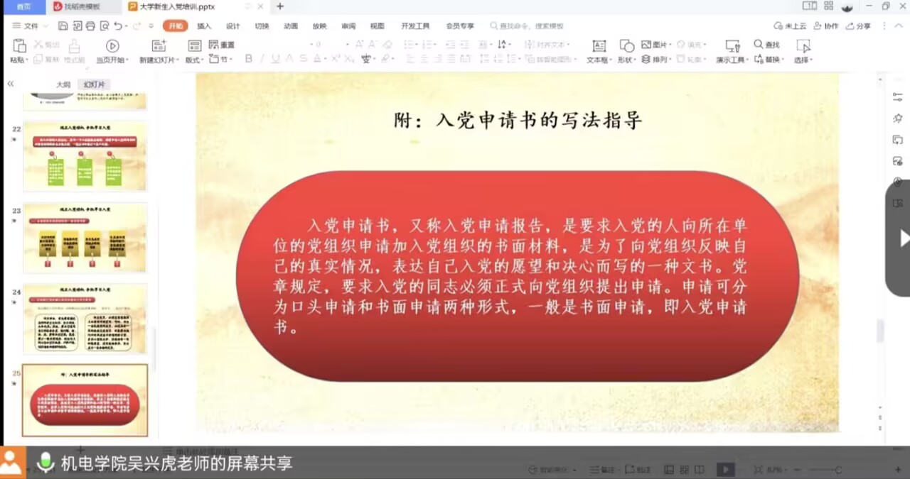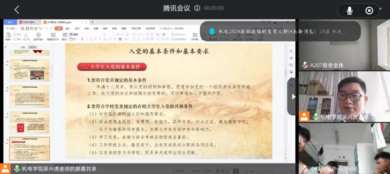 最后,针对如何写好入党申请书这一关键环节,吴兴虎老师做了认真指导:一是格式要正确。申请书一般包括标题、称谓、正文和落款。二是正文要充实。正文一般包括对党的认识、入党动机、入党决心和今后努力方向、个人和家庭基本情况。三是内容要与时俱进。要认真研读党章,及时学习党的创新理论最新成果,要联系自己的思想实际谈对党的认识,切忌照搬照抄,空话连篇。他希望2023级全体新生要扎实学习科学文化知识,努力进取,力争优秀;要善于利用大学的学习、活动来锻炼自己,提高自己的综合素质;要主动学习习近平新时代中国特色社会主义思想,不断增强“四个意识”、坚定“四个自信”、做到“两个维护”,以实际行动勇做新时代合格大学生。