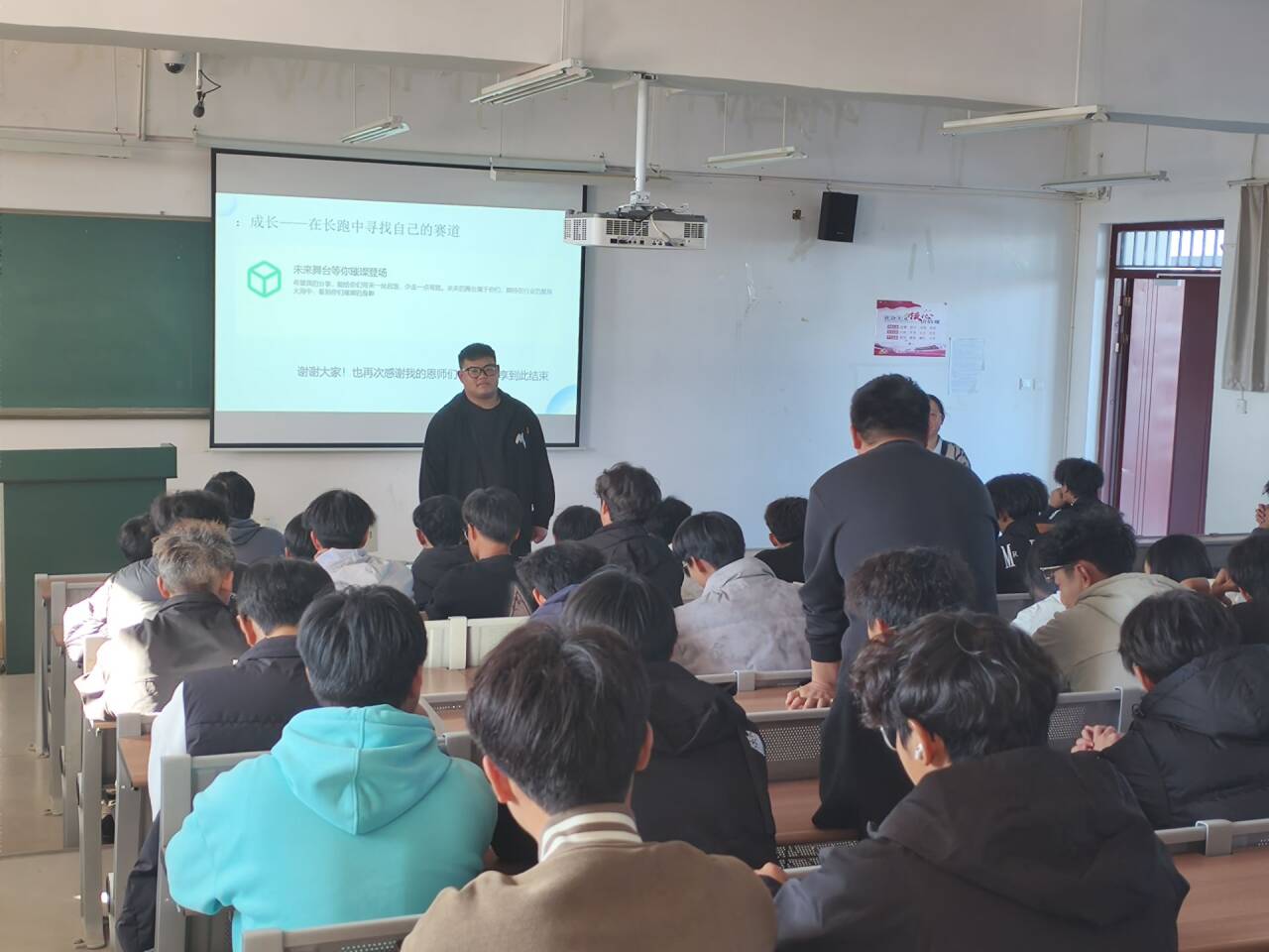 首先,刁淆学长结合自身机电领域的学习与实践经历,以“破局—扎根—成长”为主线分享成长进阶路径。他剖析了机电学子从校园到职场需完成的思维、能力、认知等核心转变,强调要扎根行业“深水区”锤炼核心竞争力,同时鼓励同学们主动提升沟通协作、责任担当等综合素养。