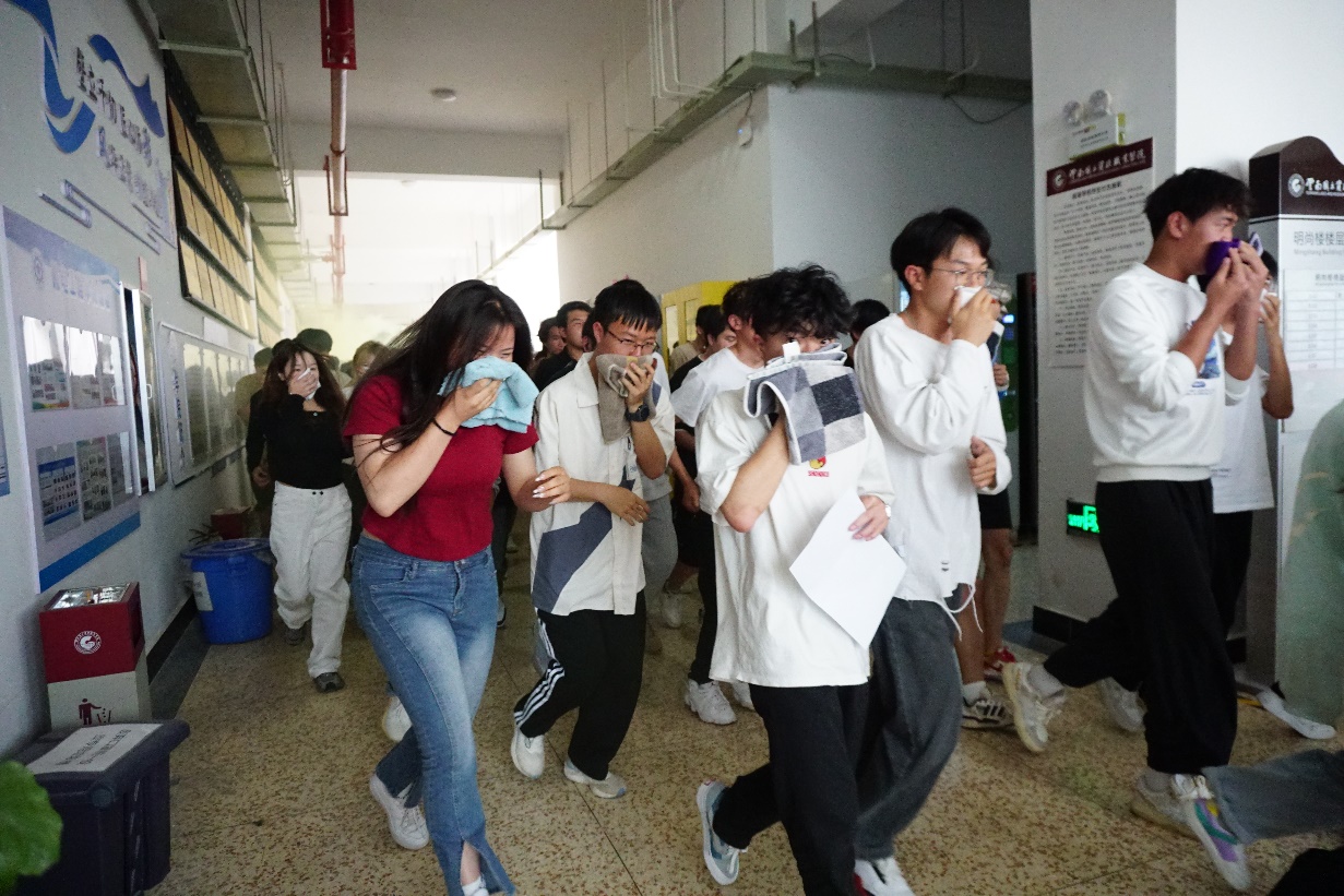 演练过程中,同学们有序逃生,做到:弯腰、扶墙、捂口鼻。全体同学低头弯腰,有条不紊地迅速撤离,中途未出现意外情况。