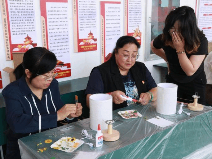 本次活动在浪漫又温暖的气氛烘托下,迎来了一场独具匠心的古风压花台灯制作之旅,不仅为身心繁忙的老师们点亮了疗愈之光,驱散心中的阴霾,还让独具特色的花艺台灯点亮了心中美好和希望。