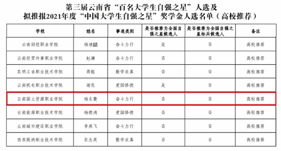 近日,由共青团云南省委、云南省学生联合会及有关单位联合开展的第三届云南省“百名大学生自强之星”寻访活动结果已揭晓,Beat365官网2020级电气三班团支部杨东夔同学被评为云南省“百名大学生自强之星”。