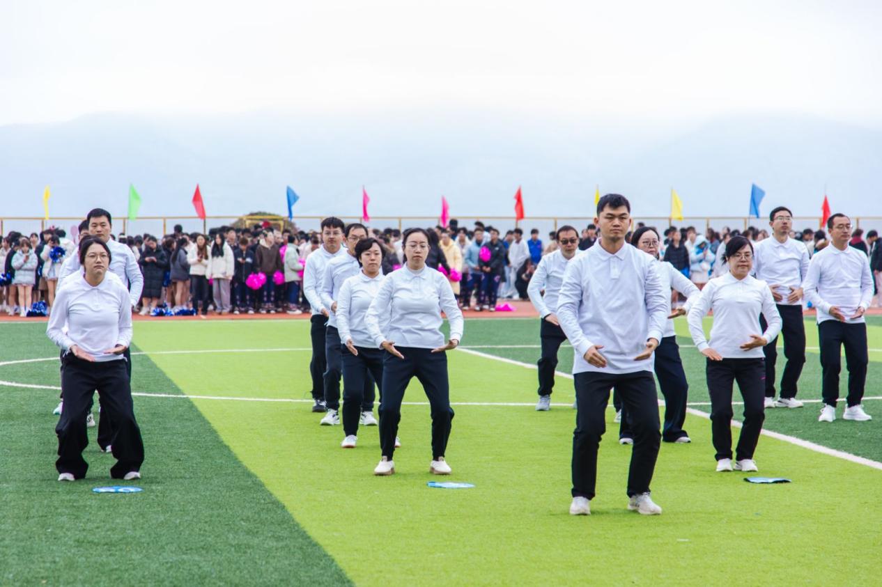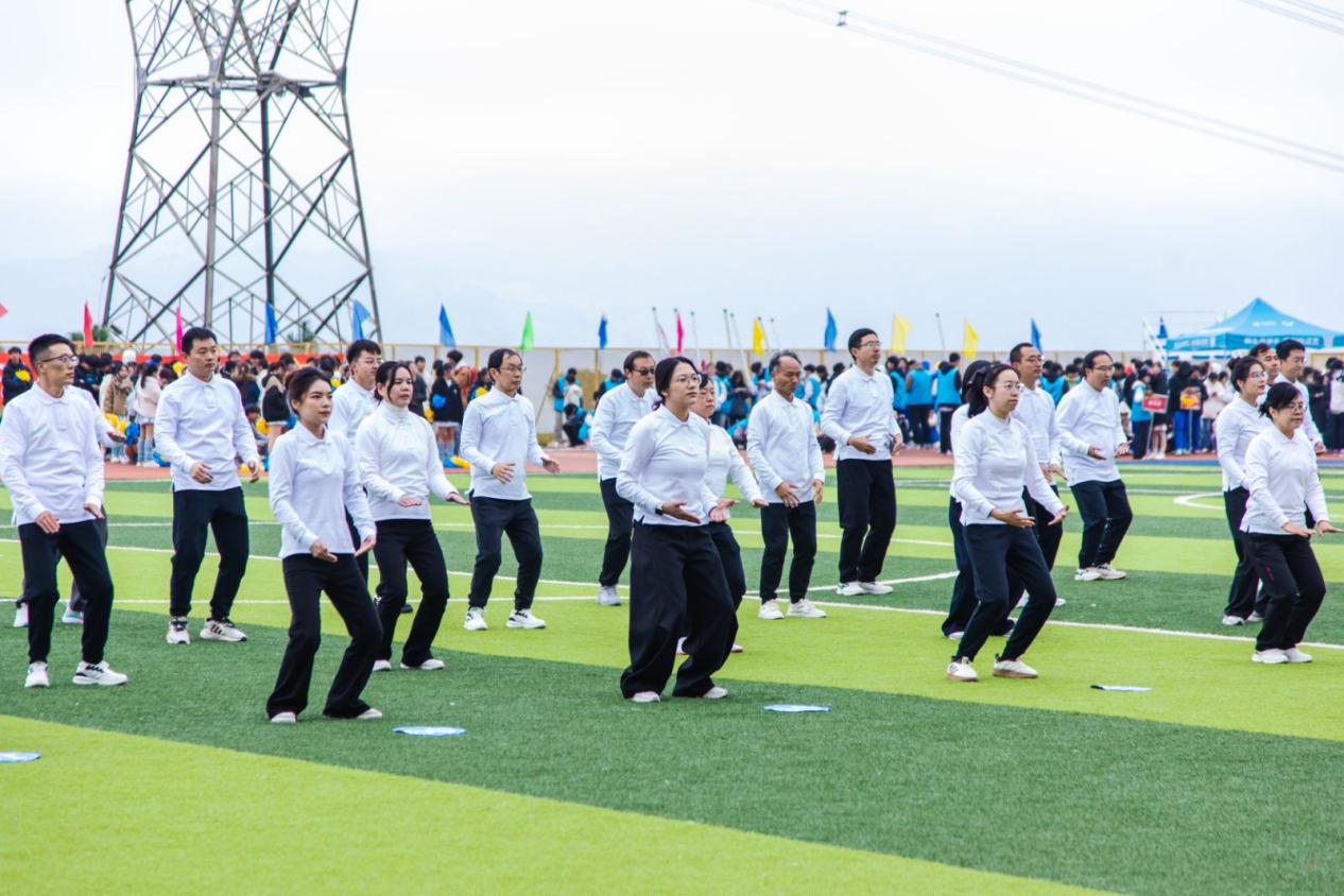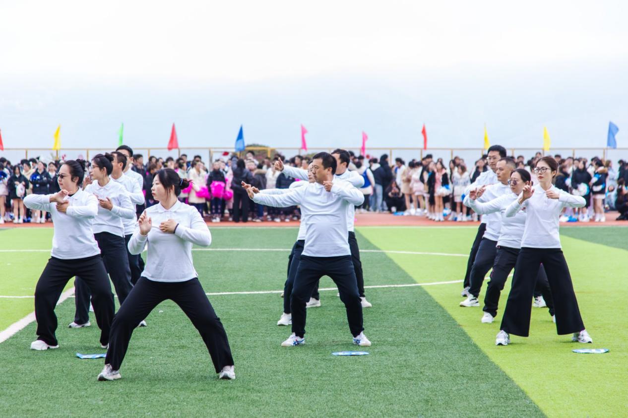 老师们身着统一服装,遵循规范套路演练,动作整齐连贯、神态专注,充分展现出中华传统养生文化的独特魅力与教职工积极健康的精神风貌。