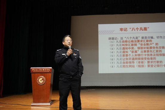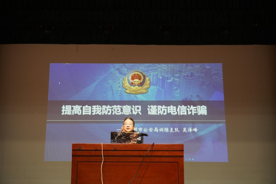 讲座伊始,吴泽峰警官结合工作中遇到的真实案例,对一些常见的诈骗形式和诈骗手段进行讲解。以生动幽默的语言,提高师生们的学习兴趣,增强大家甄别诈骗手段的能力。