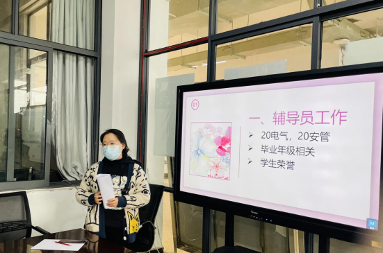 最后,学院党总支书记王春莲对本次会议做总结发言。她充分肯定了两次疫情临时管控期间,全体辅导员以校为家、奋战一线、坚守岗位的无私奉献,并代表学院感谢大家一年来的辛苦付出。她希望大家,一是要利用好假期时间,积极参加各类线上培训,加强学习充电,不断探索三全育人有效途径,做学者型辅导员;二是要结合个人职称晋升和职业规划,积极参加各类赛事,主动承担教学课程,努力申请项目,做科研型辅导员;三是要及时总结梳理工作,创新工作方式,努力从事务性工作中解放出来,做有特色、有质量的辅导员。