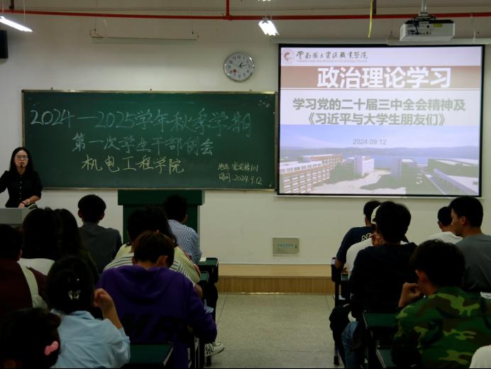 会议伊始,学生会主席汪达和团总支副书记罗杰分别对上一学期学院工作进行了总结汇报,并对本学期工作作出规划。各部门负责人依次汇报近期工作的推进情况及未来的工作计划。在此期间,大家踊跃分享工作经验,探讨工作中遇到的难题及其解决方案。全体成员在杨珍妹老师的带领下,开展了以学习党的二十届三中全会精神及《习近平与大学生朋友们》为主题的政治理论学习。马玲老师详细部署了本学期的团学工作和学生活动,要求各部门既要兢兢业业完成本职工作,又要与其他部门紧密协作,提升活动质量与实效。她还强调,学生干部应当清楚认识自身的岗位职责,准确自我定位,不断增强服务意识,从而起到良好的示范作用。