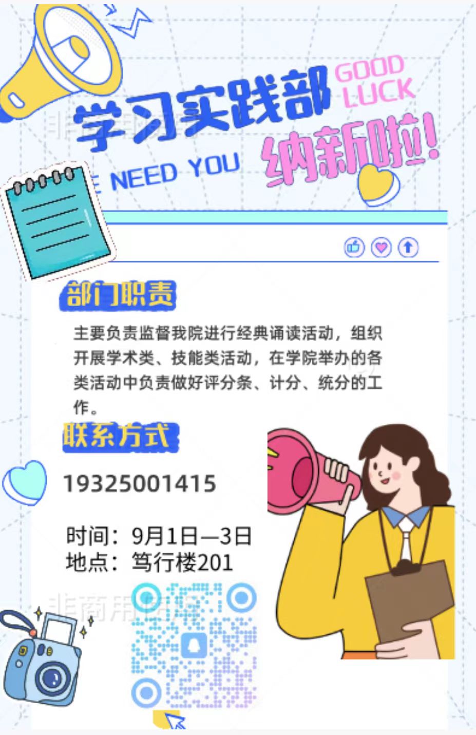 学生会宣传策划部招新啦!这里是学院活动的“视觉工厂”与“声音窗口”!我们负责设计各大活动创意海报、剪辑精彩宣传视频,定格活动高光瞬间;同时撰写鲜活新闻稿,运营学院公众号,让每一份精彩都被看见、被传播。无论你擅长设计、摄影,还是热爱文字、运营,只要有热情,就来加入我们,共赴这场创意与责任的美好相遇!