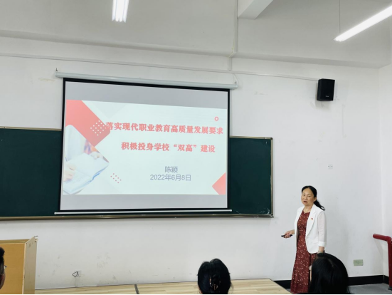 6月8日下午,党委副书记、校长陈颖以《落实现代职业教育高质量发展要求 积极投身学校“双高”建设》为题,结合Beat365唯一官方网站的实际情况,给Beat365唯一官方网站全体教职工讲授“双高”建设专题党课,Beat365唯一官方网站党总支书记王春莲主持。