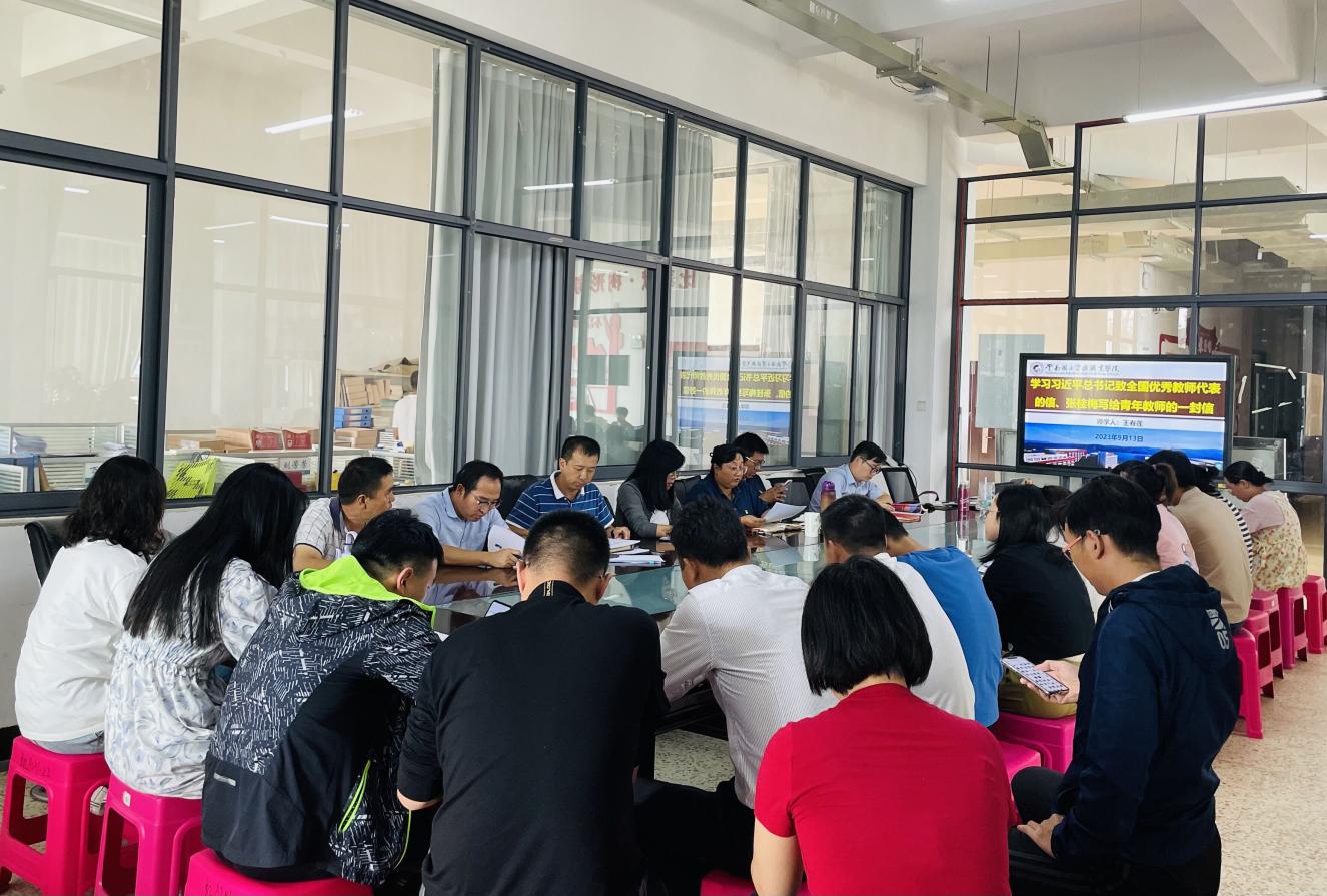 9月13日中午13:00,Beat365唯一官方网站在明尚楼A201开展了2023年9月份第二次教职工政治理论学习会。本次理论学习会由学院党总支书记王春莲领学,主要学习了习近平总书记致全国优秀教师代表的信、张桂梅写给青年教师的一封信。