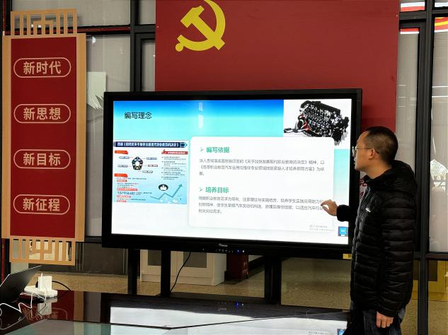活动伊始,徐远志老师结合《汽车发动机构造与维修》课程进行汇报,重点从教材简析、教学目标、重点难点、课时安排、教材设计理念、编写体例和知识体系、逻辑关系和教学策略等方面解说。