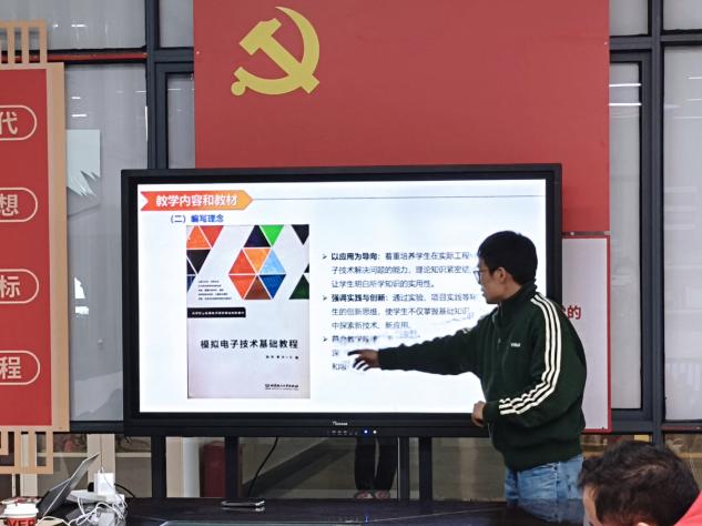 董治全老师汇报《模拟电子技术基础教程》课程,从课程设置依据、课程标准、课程思政的设计与实施、教学设计的变革、教学资源重构与应用、课程教学团队、课程应用与特色等方面解说课程建设现状与规划。