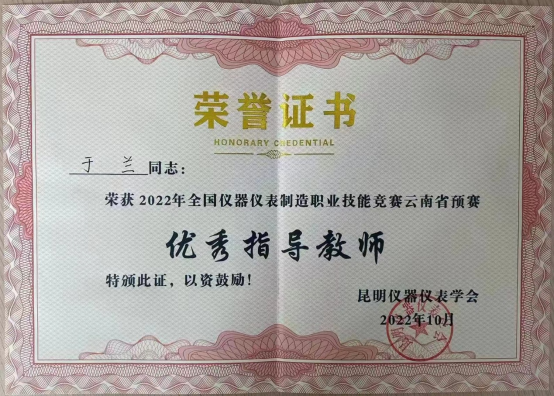 2020级智能控制1班唐周霞、毕健富荣获2022年全国仪器仪表制造职业技能竞赛云南省预赛仪器仪表制造工项目(双人赛)学生组二等奖,指导老师王强卫、崔庆权获优秀指导教师。
