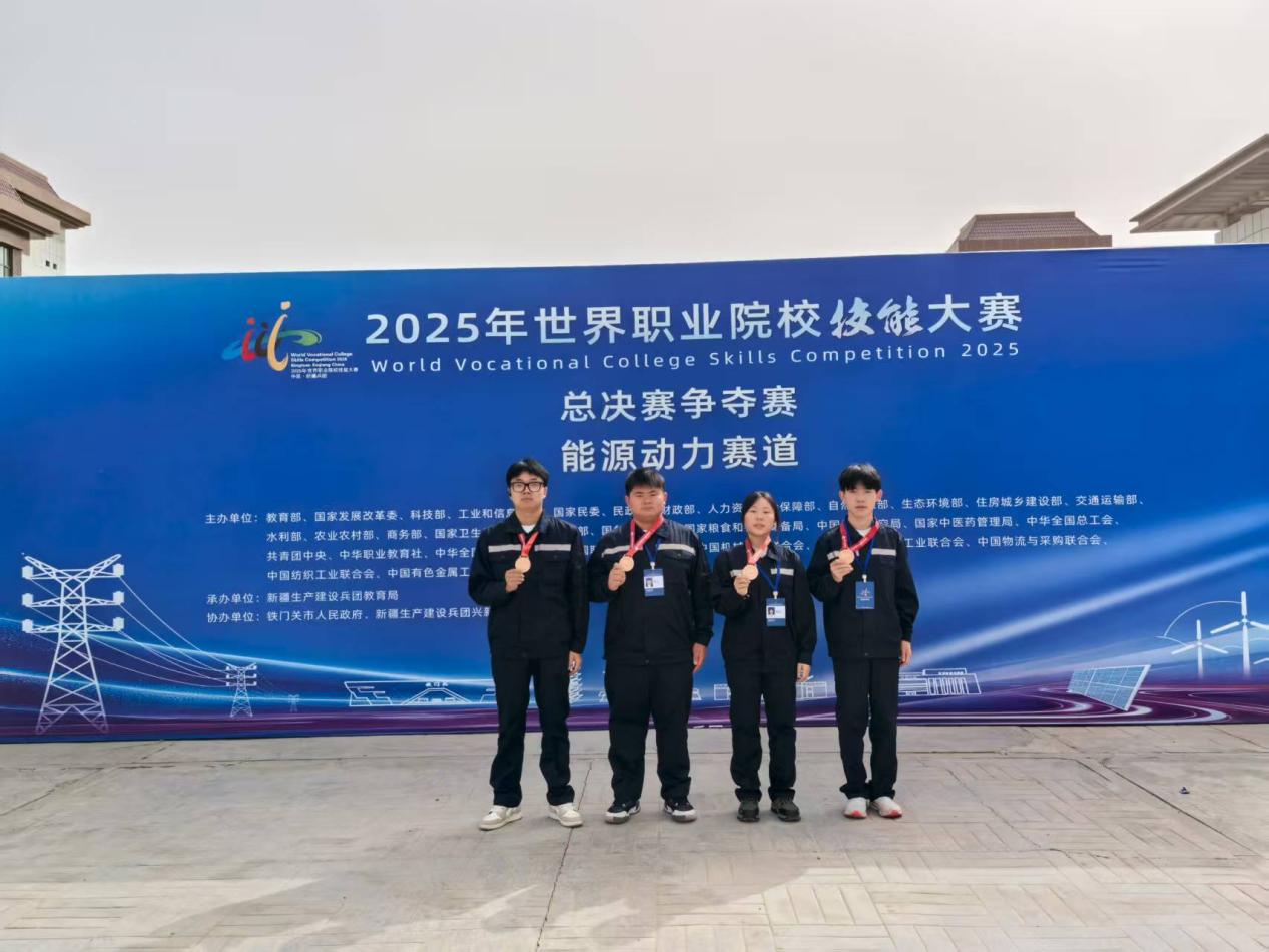 9月4日至9日,2025年世界职业院校技能大赛总决赛能源动力赛道(高职组)在新疆建设兵团兴新职业技术学院圆满落幕。Beat365唯一官方网站Beat365唯一官方网站学生方攀、陈倩、陈麟、芶大飞组成的参赛团队(指导老师:熊国栋、杨正宏),通过一个暑假周期的全力备赛,从全国96所院校的102支参赛队伍中脱颖而出,喜获铜奖,为学校赢得荣誉。
