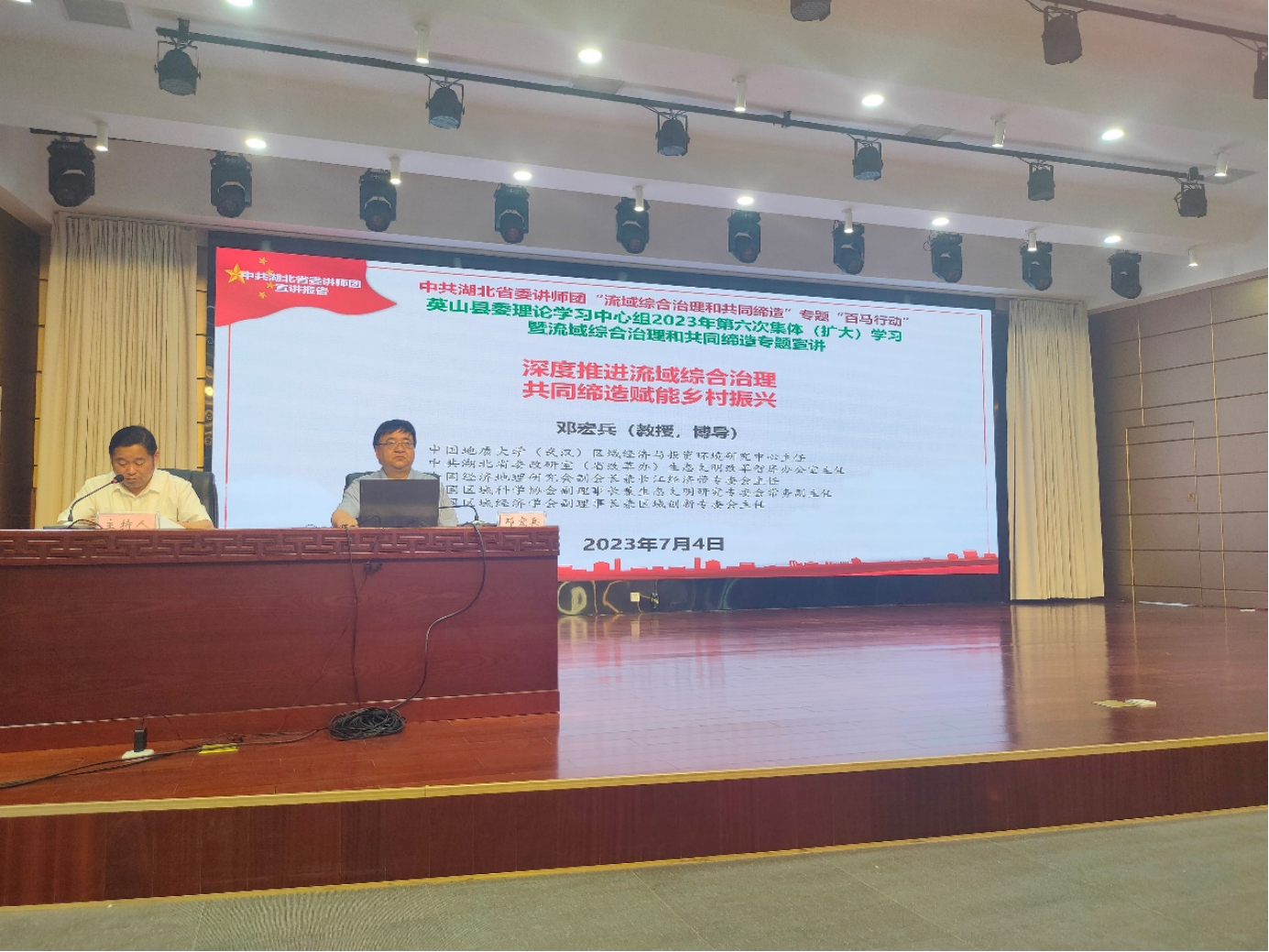 根据中共湖北省委讲师团统一安排部署,7月3日至4日,永利官网金融与贸易系邓宏兵教授赴英山县参加中共湖北省委讲师团“流域综合治理和共同缔造”专题“百马行动”宣讲活动。7月4日上午给英山县委理论学习中心组2023年第六次集体(扩大)学习做了《深度推进流域综合治理,共同缔造赋能乡村振兴》专题辅导报告。邓教授从深度推进流域综合治理和共同缔造赋能乡村振兴两个角度,阐明如何在实践中把握党的二十大精神,深度推进流域综合治理和统筹发展,自觉践行习近平生态文明思想,共同缔造谱写乡村振兴新篇章,绘制生态优先、绿色发展的蓝图。邓宏兵教授在此次宣讲调研过程中,根据有关部门反映的情况和意见,充分发挥专家优势,针对英山县在流域综合治理和乡村振兴等工作中遇到的问题献言建策,助力其进一步理清工作思路,结合英山优势特色,充分发挥比较优势,推进各项工作高质量发展。