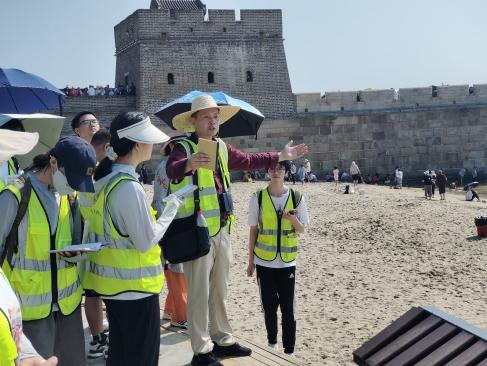 长城是中国古代重要的军事防御设施,世界文化遗产。秦皇岛的长城拥有我国最多样化的长城类型,“山、海、关、城”,特色鲜明,类型丰富。教学实习从入海长城——老龙头景区开始,同学们情绪高涨,在老师们的详细教学讲解及同学们参与的景点讲解下,大家参观了龙武营、澄海楼、入海石城、海神庙等多个标志性景点。伴随海浪拍打长城卷起的千堆雪,我们了解了长城入海处的地形地势、基岩特征以及海岸类型;参观了古代军营文化及军事管理机构的组成与设置;学习了景区建筑特色、功能设计及建筑布局;观察到了景区游客活动类型;并在邓小平“爱我中华,修我长城”的题词碑前庄严许下承诺,热爱和保卫中华,是我辈青年人的使命和担当。